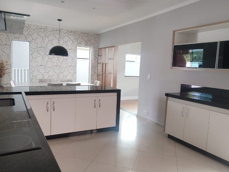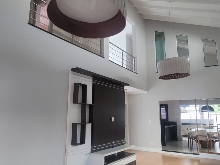 No piso superior, encontram-se três dormitórios (dois deles com armários planejados), um segundo escritório e banheiro social, proporcionando espaço e versatilidade para toda a família.