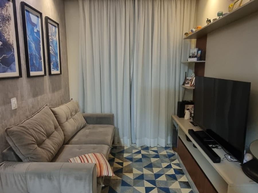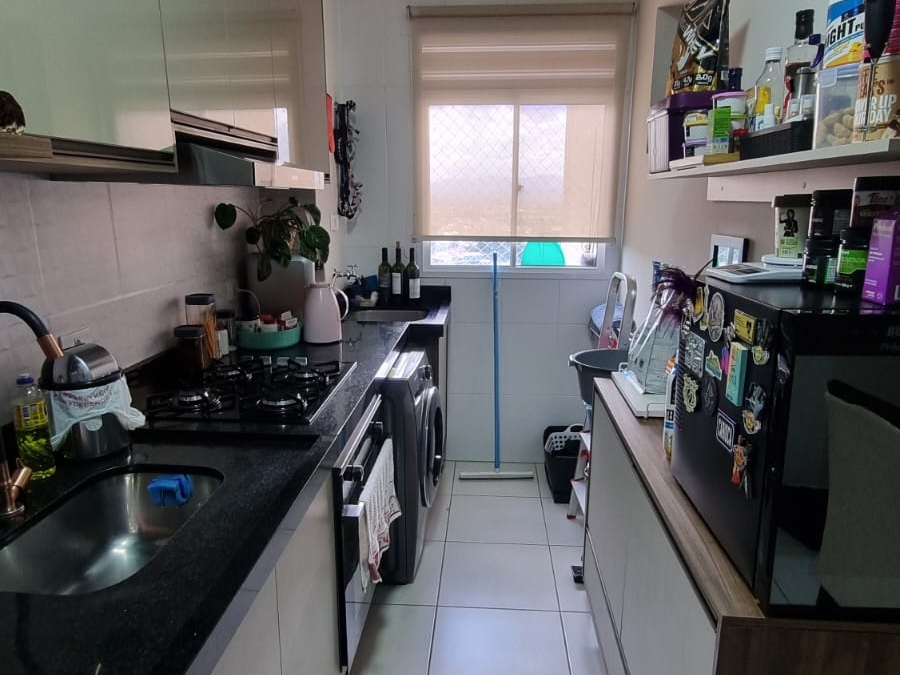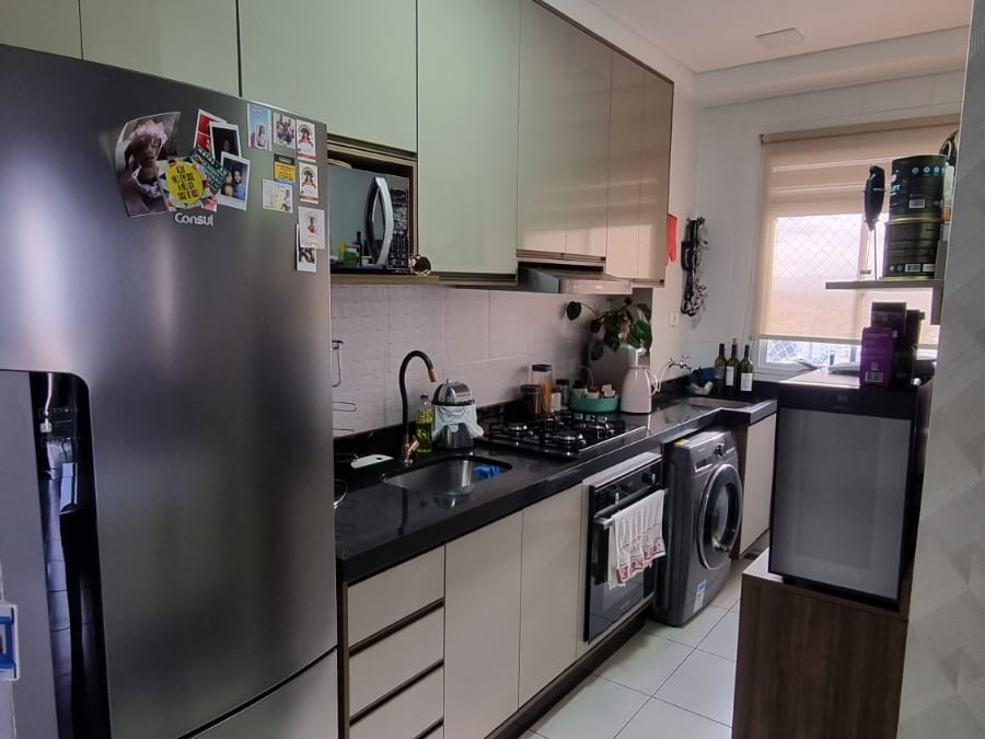 Sala dois ambientes, dois dormitórios sendo uma suíte, cozinha com móveis planejados, banheiro social com box e uma vaga de garagem descoberta, no décimo quarto andar com cinquenta e sete metros quadrados.