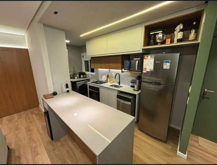 A cozinha gourmet integrada à área social valoriza a funcionalidade e cria um ambiente acolhedor para receber amigos e familiares. São 02 dormitórios (sendo 01 suíte), projetados para conforto e praticidade, com armários que otimizam os espaços. O apartamento conta ainda com 01 vaga de garagem coberta no subsolo.