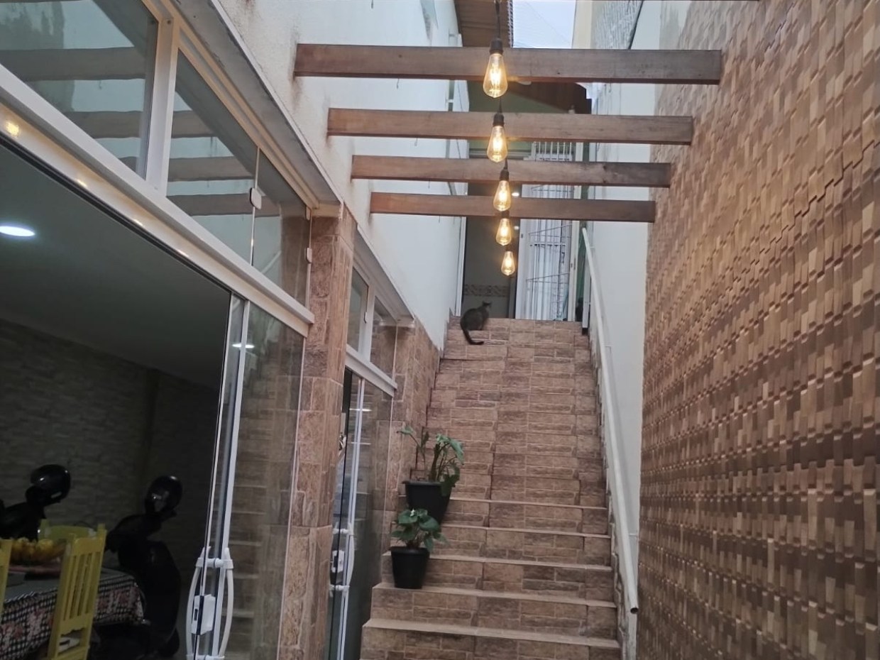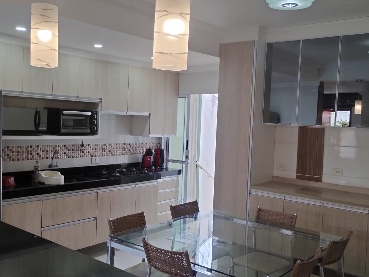 No piso superior, sala acolhedora, dois dormitórios, sendo uma suíte do casal com guarda-roupa planejado, além de banheiro social e cozinha com armários planejados.